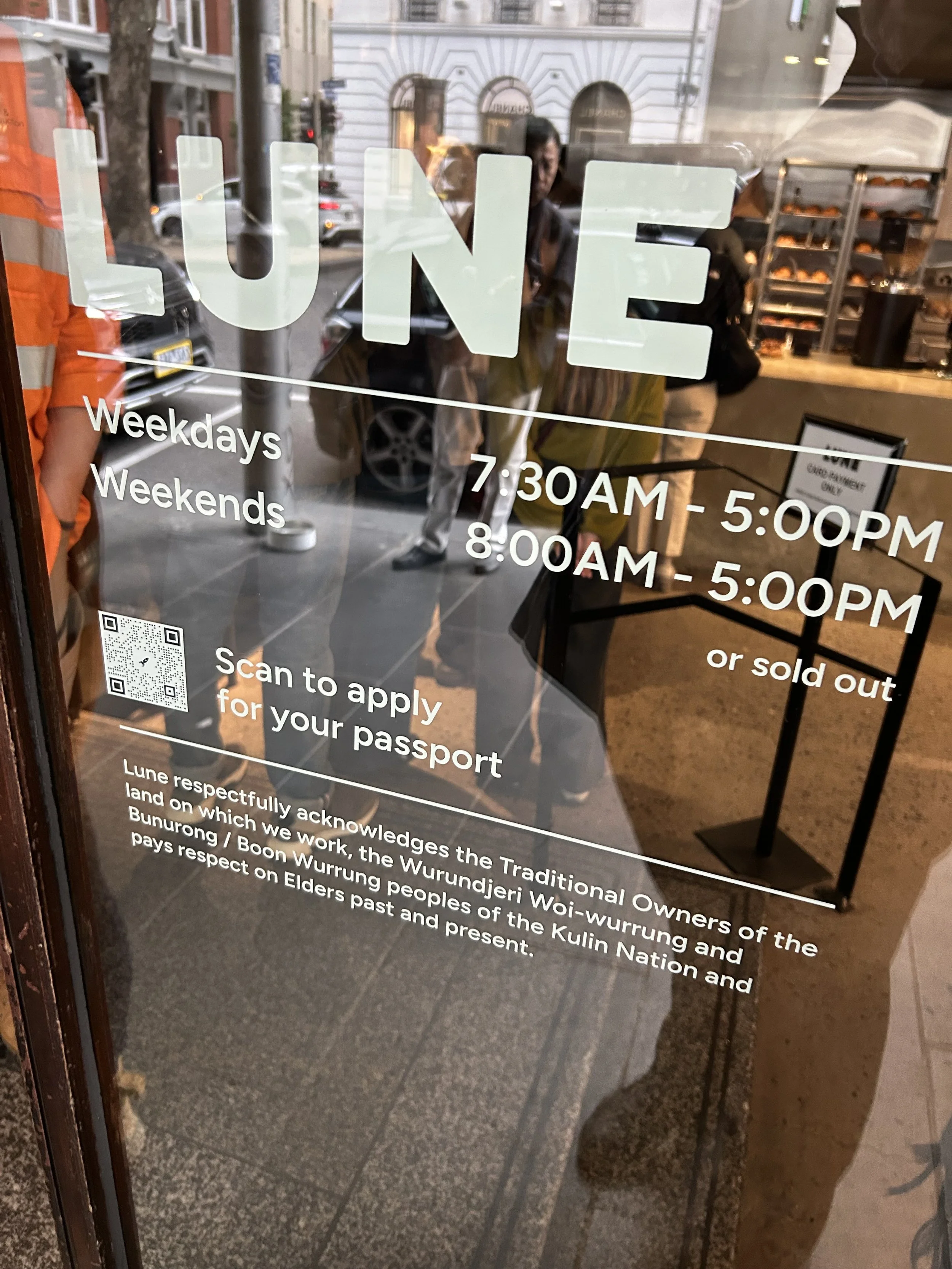 Mrs G decided that sleeping almost the entirety of the flight over wasn’t enough and promptly decided to sleep in this morning. So me, the ever loving husband, legged it over half the Melbourne CBD to the esteemed Lume bakery for what has been voted the best croissants in the world, I mean you know these were good when you saw the line of business people, students, tourist and construction workers waiting in the line outside the bakery. One guy passing commented to me that “ is this a line for the bakery, it must be a good one?” before I had chance to mutter in the affirmative the three construction workers in front of me complete with hard hats and yellow vests answered lovingly about the merits of the pastries.