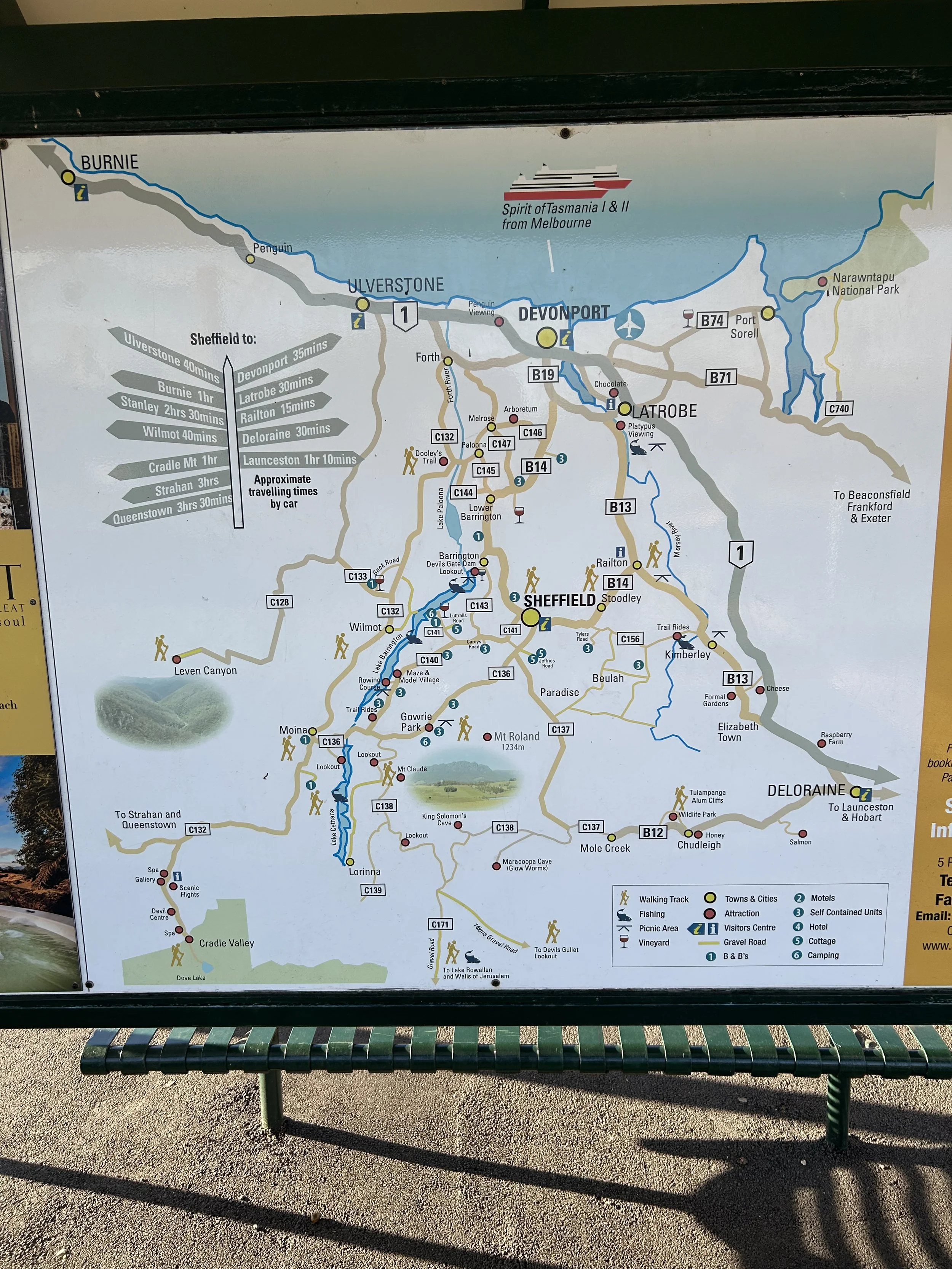 No not that one, Sheffield, Tasmania possibly the most serine , peaceful towns I have ever visited. They are known for their murals and it was indeed a picturesque setting. It was also very charming, quirky and friendly (that word friendly seems to be cropping up a lot on this adventure, think on that Athens). All I am saying is the type of town a man can take his pet Llama for a walk down the high street and no one bats an eye is the type of town I want to live in.